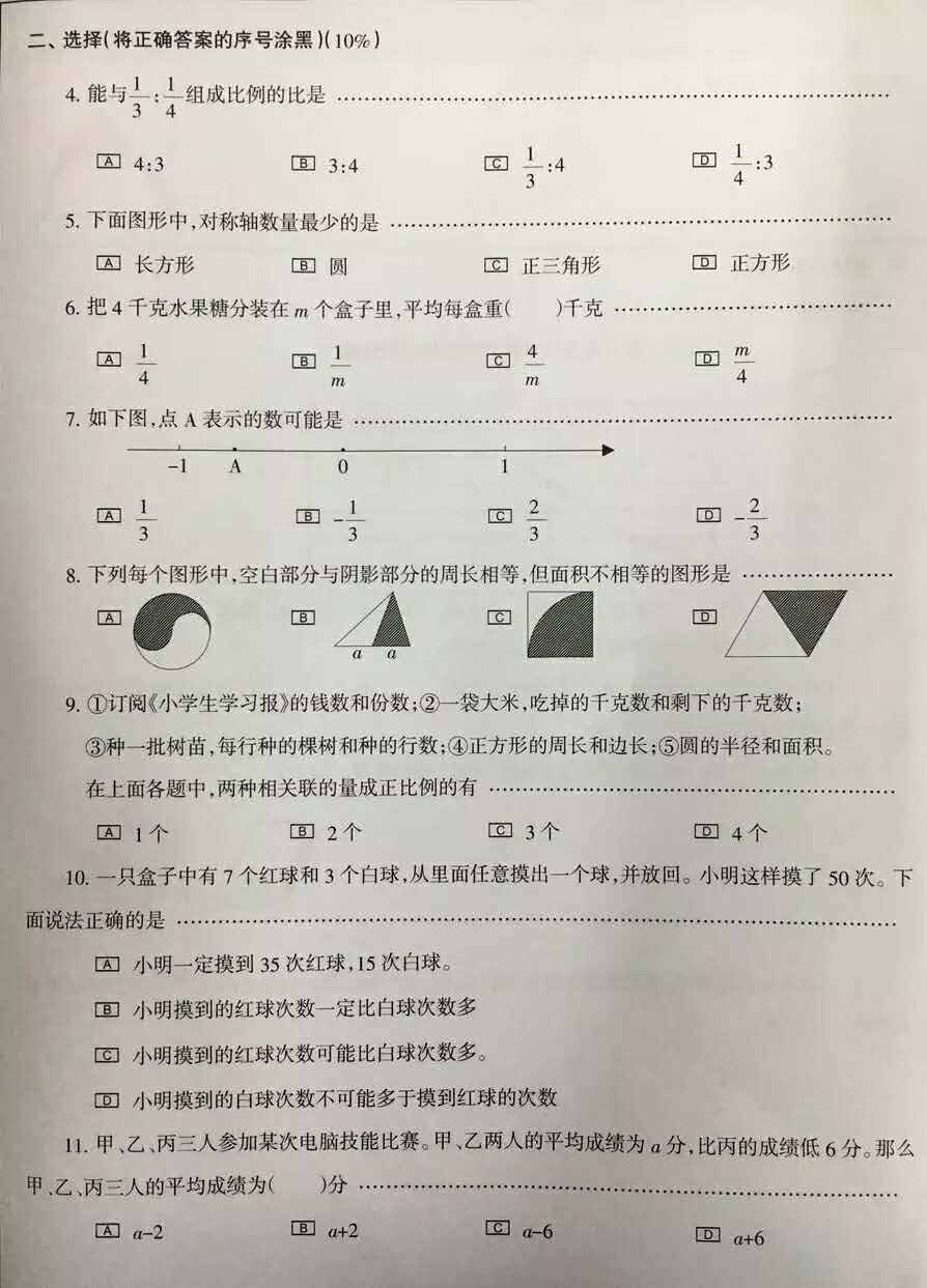 2016年宁波舟山小学毕业考试数学试卷