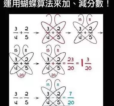 以往会找出两分母的最小公倍数再计算。但其实只要在算式上画只蝴蝶就解决了。把蝴蝶翅膀圈在一起的部分相乘写在触角里面,彼此相加就是答案的分子,再把分母彼此相乘,就是答案的分母。减法也是一样的方式,只要把触角里的数字改成相减即可。