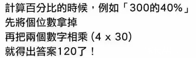 计算百分比的时候,其实“%”就能抵消两个零。比如计算“300的12%”时,只需要把“300”后面的两个“0”去掉,就可以划去“%”了,剩下就是“3x12=36”了,是不是很轻松。
