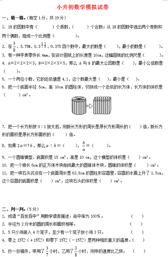 2017宁波小升初数学复习模拟题(五)