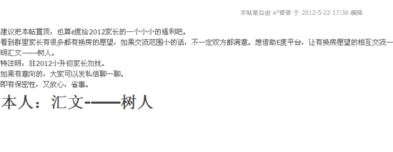 内容提要:小升初择校后,为了让孩子上学方便,家长们愿意将自己的学区房与孩子所择学校的学区房进行交换。此贴在一瞬间引起了家长们的热情关注。