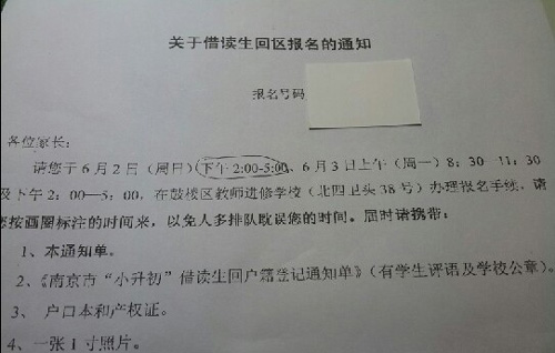 2013年南京市跨区借读生5月1日、2日回户籍地登记通知