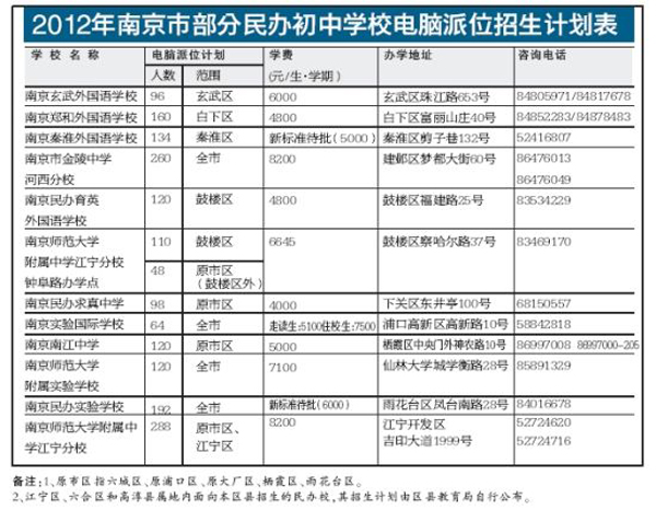 2012年南京市部分民办初中学校电脑派位招生计划表