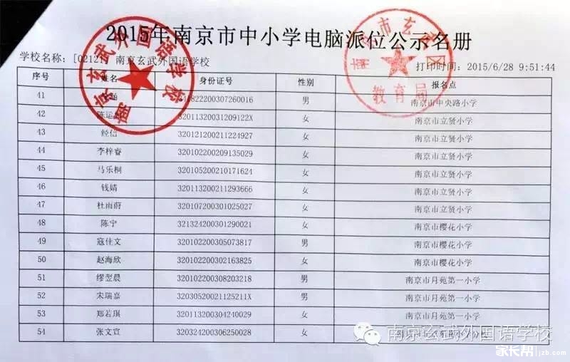 2015年南京小升初电脑派位,玄外摇号报名共计604人,摇号录取54人,中签率8.9%,具体名单如下——