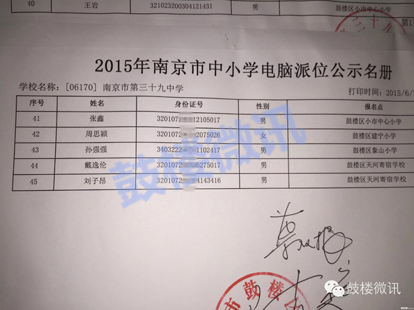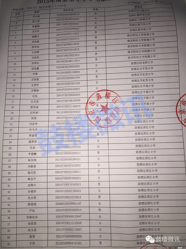 2015年南京小升初电脑派位,三十九中报名摇号142人,摇号录取45人,具体名单如下——