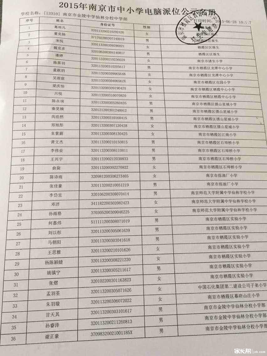 2015年南京小升初电脑派位,金陵中学仙林分校中学部电脑派位摇号录取36人,具体名单如下: