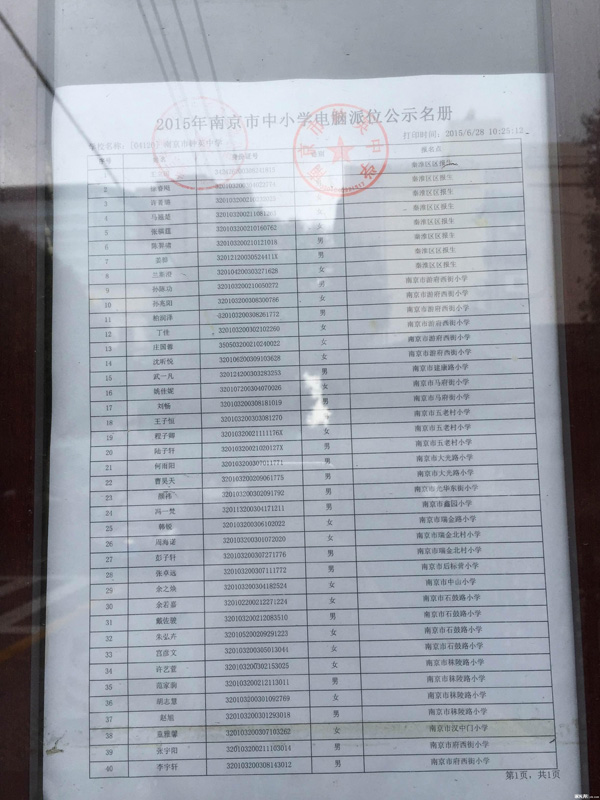2015年南京小升初电脑派位,钟英中学报名摇号247人,摇号录取40人,具体名单如下——