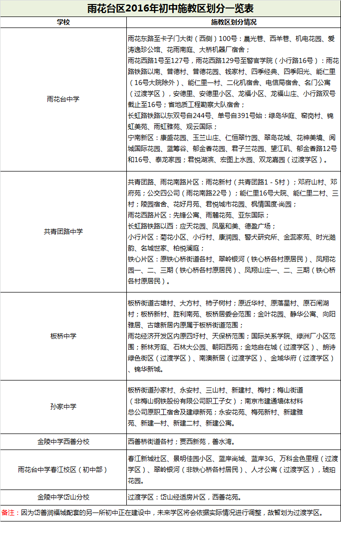 南京市雨花台区2016年初中施教区划分情况 南京奥数网 2016-05-04 15:18:52 南京市雨花台区2016年初中施教区划分一览表 相关推荐: 2016年南京小升初政策详细信息解读 2016年南京市小升初招生工作时间安排 2016年南京小升初跨区就读回户籍地登记说明 2016年南京市中小学招生政策15问 2016年南京市各区小升初招生实施方案汇总