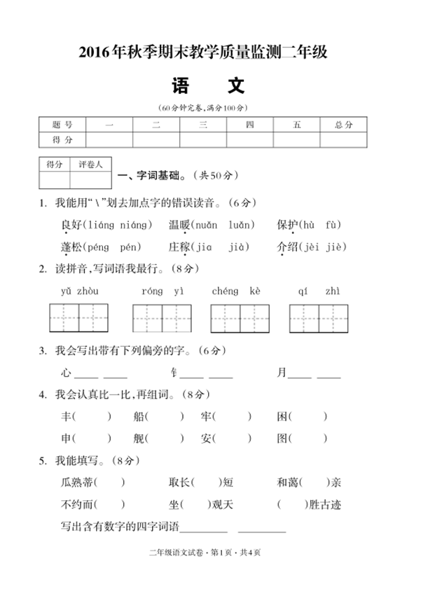 2019年南京市小学二年级语文期末模拟卷三(图片版)