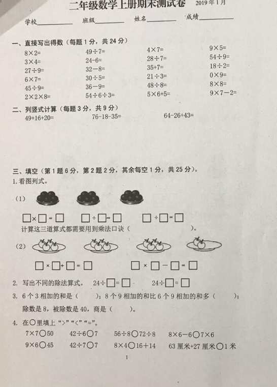2019年南京市栖霞区小学二年级数学期末试卷(图片版)