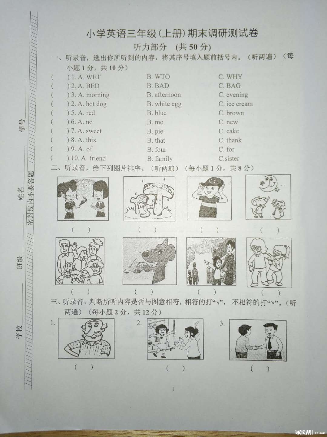 2019年南京市江宁区小学三年级英语期末卷(图片版)