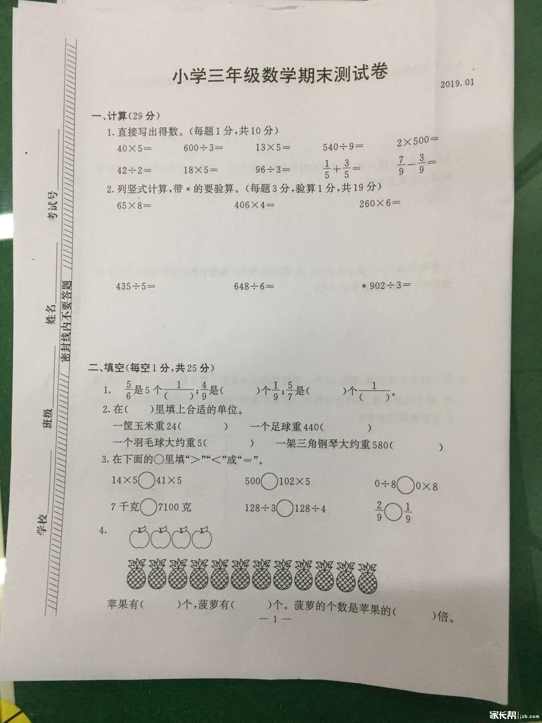 2019年南京市鼓楼区小学三年级数学期末卷(图片版)
