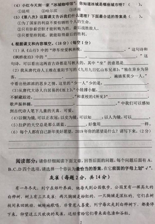 2019年南京市栖霞区小学三年级语文期末卷(图片版)(2)