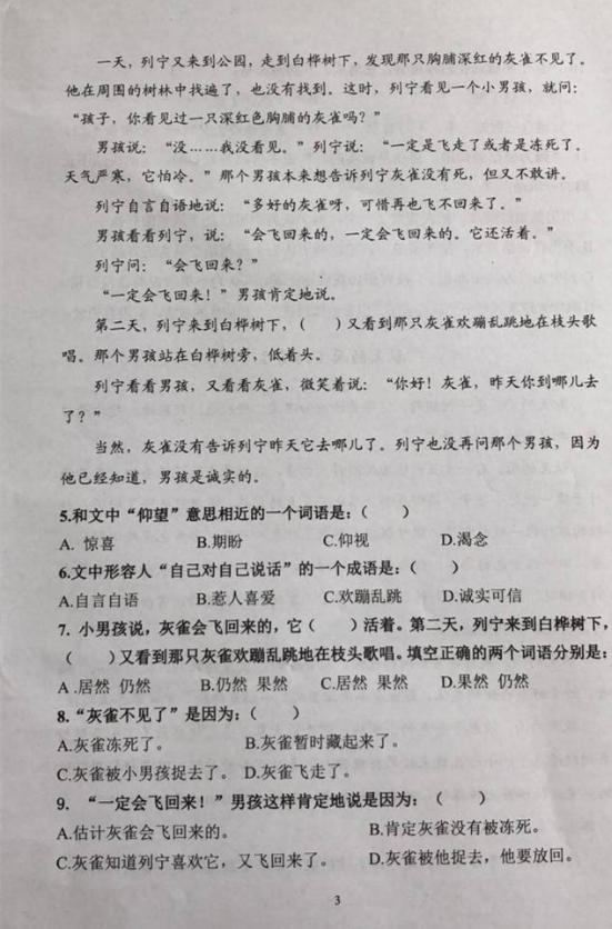 2019年南京市栖霞区小学三年级语文期末卷(图片版)(3)