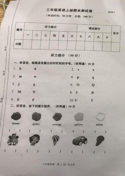 2019年南京市栖霞区小学三年级英语期末卷(图片版)