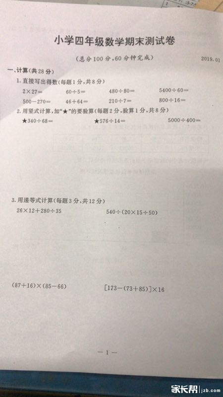 2019年南京市鼓楼区小学四年级数学期末卷(图片版)