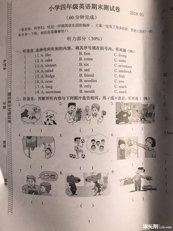 2019年南京市鼓楼区小学四年级英语期末卷(图片版)