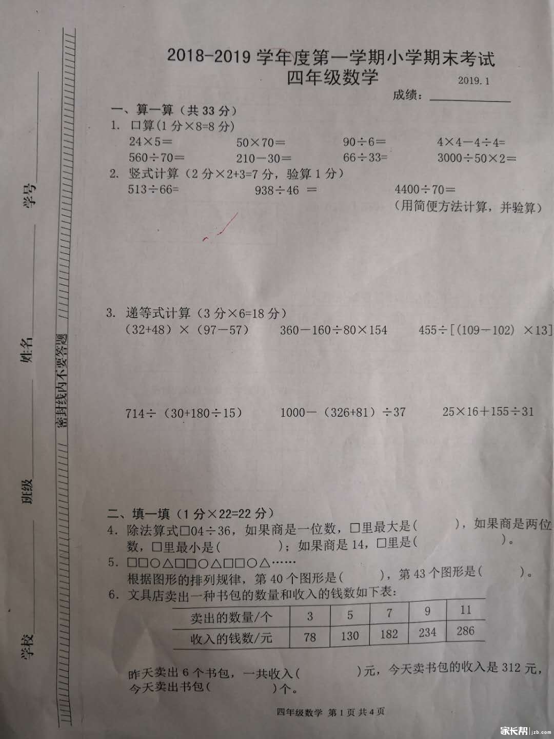 2019年南京市浦口区小学四年级数学期末卷(图片版)