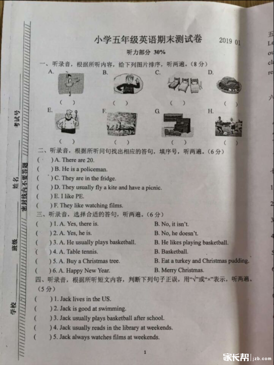 2019年南京市鼓楼区小学五年级英语期末卷(图片版)