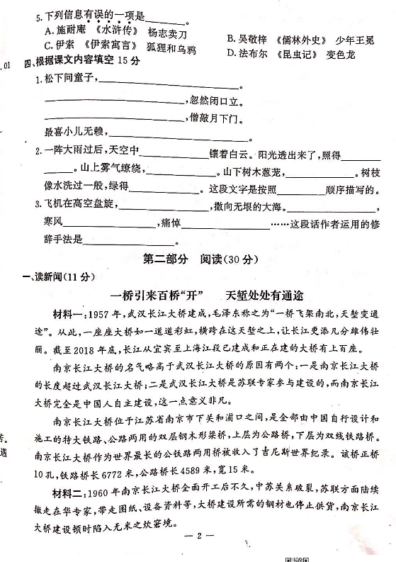 2019年南京市鼓楼区小学五年级语文期末卷(图片版)(2)