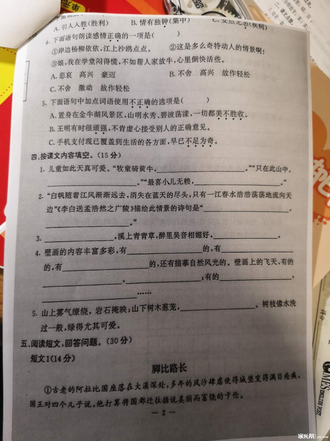 2019年南京市六合区小学五年级语文期末卷(图片版)(2)
