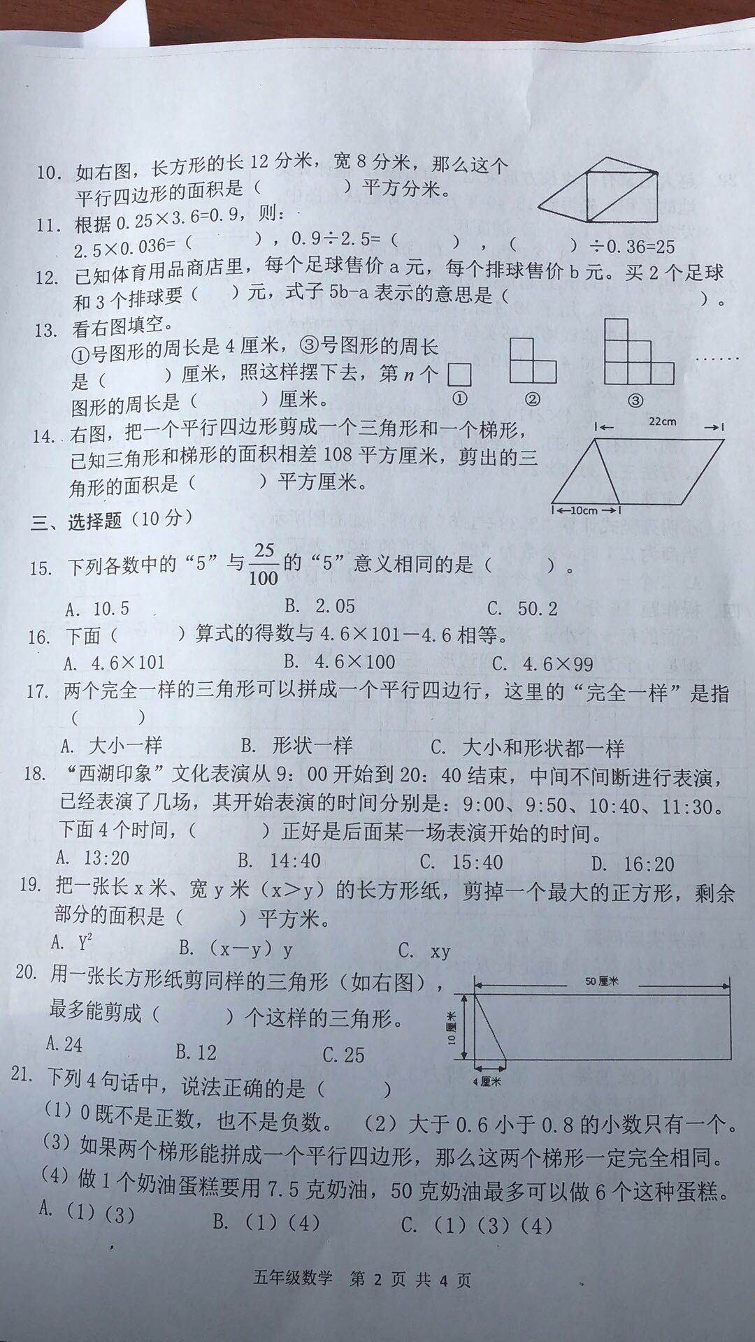2019年南京市浦口区小学五年级数学期末卷(图片版)(2)