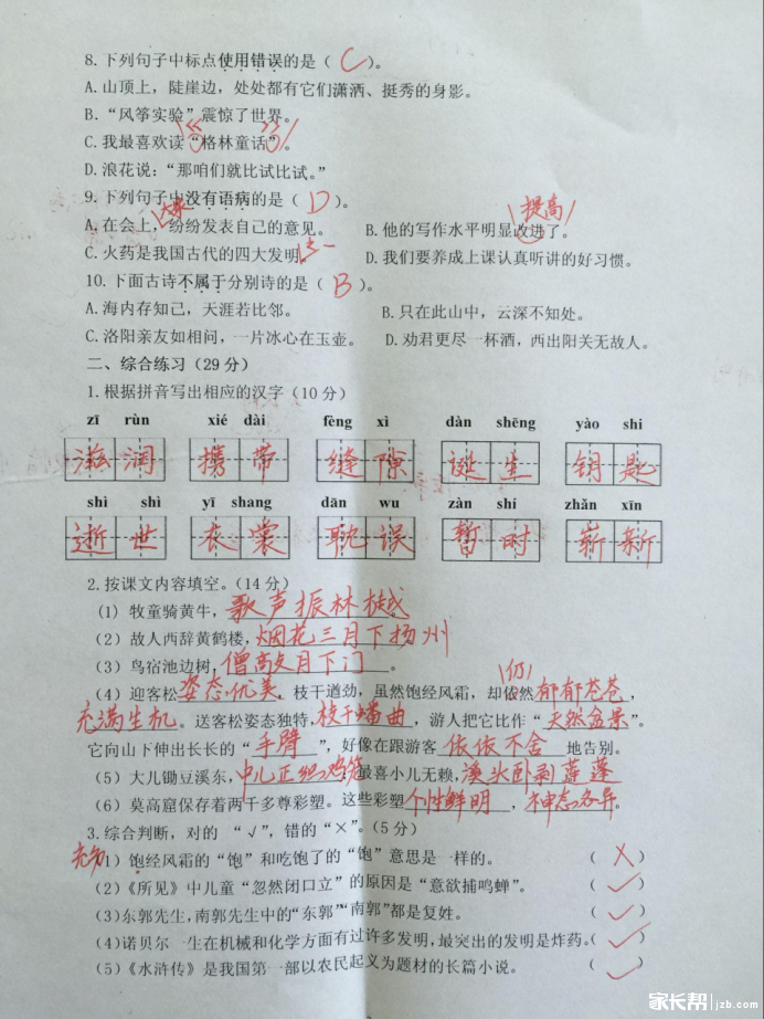 2019年南京市浦口区小学五年级语文期末卷(图片版)(2)