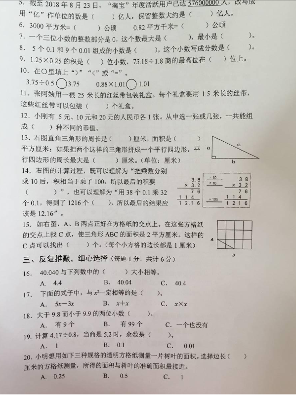 2019年南京市玄武区小学五年级数学期末卷(图片版)(2)