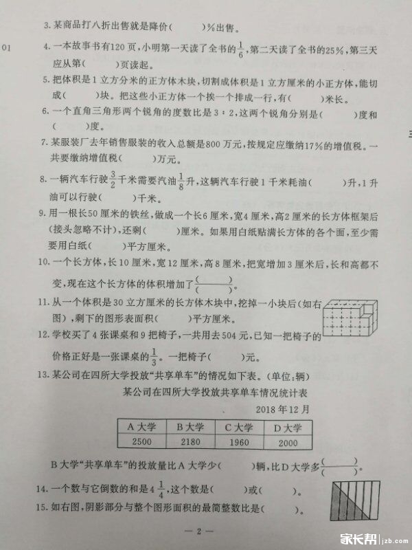 2019年南京市鼓楼区小学六年级数学期末卷(图片版)(2)