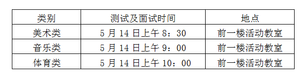 1、测试时间及分组:将所有申请报考我校的特长生按类别进行分组,即美术类、音乐类和体育类,按照先后顺序分别进行测试,具体安排如下