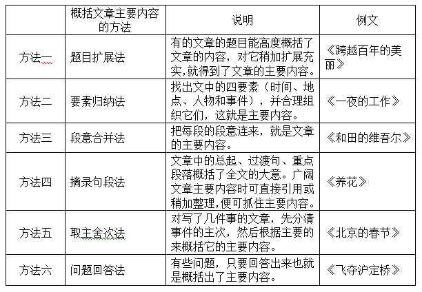 概括文章的主要内容,训练这一能力时,我们应选取不同结构的文章,引导学生发现各自的规律,掌握概括各种结构文章主要内容的不同方法。