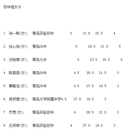 首届育才杯全市中小学国象赛初中组女子赛果公布 青岛奥数网整理 2012-03-29 10:43:27 编辑推荐:》》》 青岛小学六年级英语单词运用题 想上天山小学 需要购买哪个位置的学区房 2012年“天泰杯”全市中小学生寒假征文获奖名单 中学生新闻联盟赛 2011青岛市市北区跨区调拨申请参考 青岛小升初简历投出的最佳时间