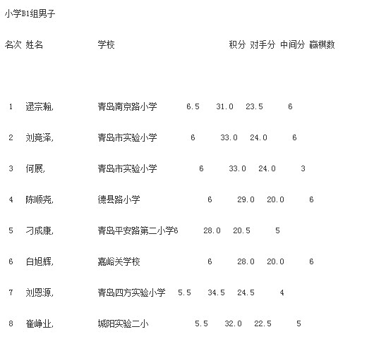 首届育才杯全市中小学国象赛小学B1组男子赛果公布 青岛奥数网整理 2012-03-29 10:45:37 编辑推荐:》》》 小升初语文 状物作文的写作方法 青岛小升初 特长生考试当天需注意细节 小升初语文 记事作文怎样写 科学知识提前看 帮孩子做好小升初衔接 小升初分班考试写作夺分技巧 青岛小学六年级英语选择填空题