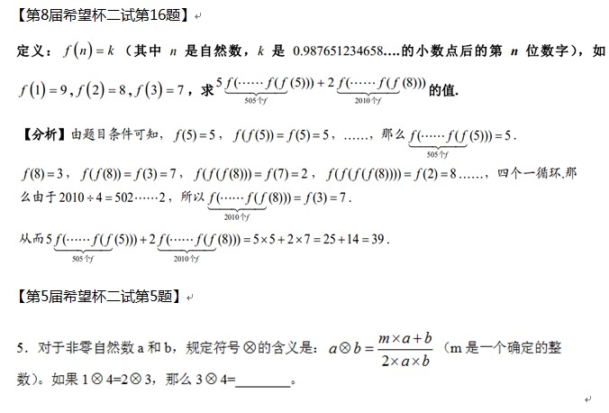 2012年4月8日第二十三届中学“希望杯”全国数学邀请赛,以及第十届小学“希望杯”全国数学邀请赛复赛即将开赛!为帮助各位考生做好最后冲刺,岛城五月风老师为大家整理了希望杯常考知识点,不仅有例题、练习题还有非常给力的解析!需要的考生赶紧下载啦!以下为希望杯常考知识点——计算分析内容预览:
