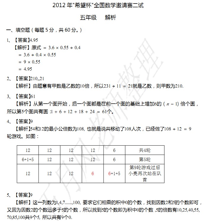 2012年希望杯二试五年级组答案解析