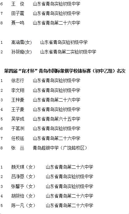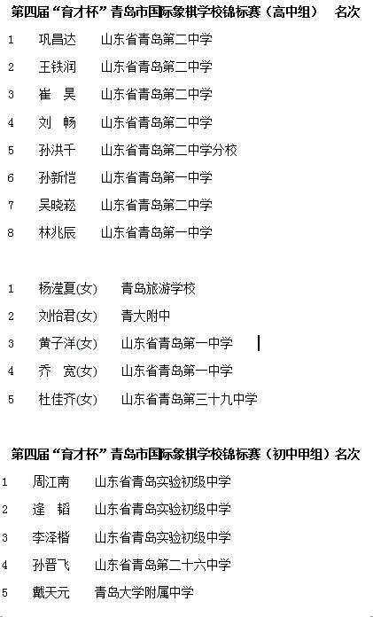2015年第四届“育才杯”青岛市国际象棋学校锦标赛成绩出炉啦,下面小编将各年级组成绩名单转发如下,供2015年青岛育才杯的参赛考生参考。
