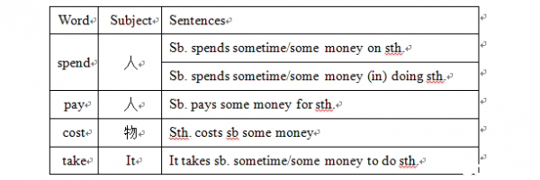看到上面的表格,晓琴老师首先教大家如何辨别每个单词的主语是人还是物。spend和pay这两个单词中都有个字母P,可以巧记它代表的是People,所以它们的主语是人,剩余的两个单词主语是物。这样记主语有没发现简单多了呢?另外spend与take如何记后面动词的形式是doing还是todo呢?spend以字母d结尾,所以搭配doing,take以字母t开头,所以搭配todo.这样记动词搭配是否已经记住了呢?