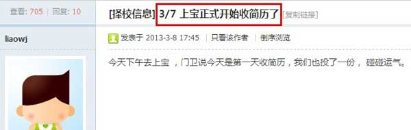 上海奥数网讯 2013年3月10日,据e友消息:3月7日上宝中学已经开始正式收简历了,有意向的家长请注意! >>>相关阅读:3/7 上宝正式开始收简历了