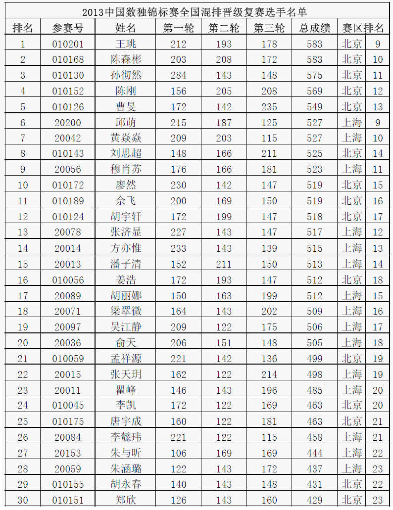 2013中国数独锦标赛全国混排晋级复赛选手名单