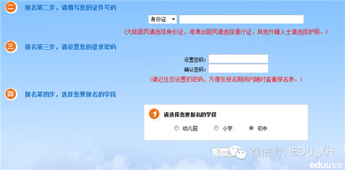 第四步,填写证件号码,设置登录密码,选择报名学段,然后按“下一步”;