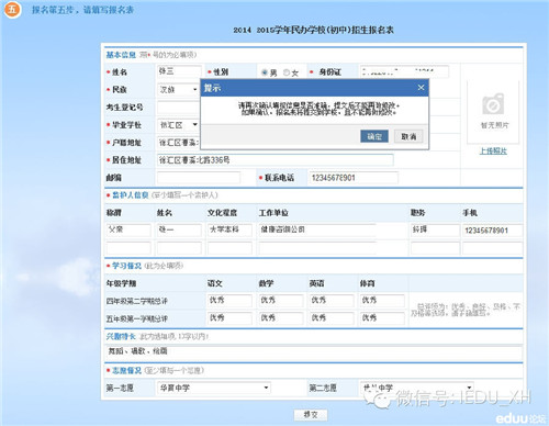 第五步,填写报名表,打“*”的为必填项,请确保正确填写,然后点击“提交”。幼儿园、小学、初中报名表样张请浏览相关文章“2014年徐汇区市示范性幼儿园、民办学校网上报名说明”;