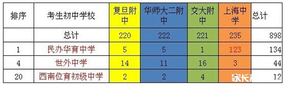 华育中学和上海中学的关系亲属一目了然,而世外的推优相对比较平均比较偏向除了上中的其他三校,因为上中主要徐汇区的推荐名额基本都在华育。西南位育的预录取来源全靠学员自身成绩优异,属于自荐。