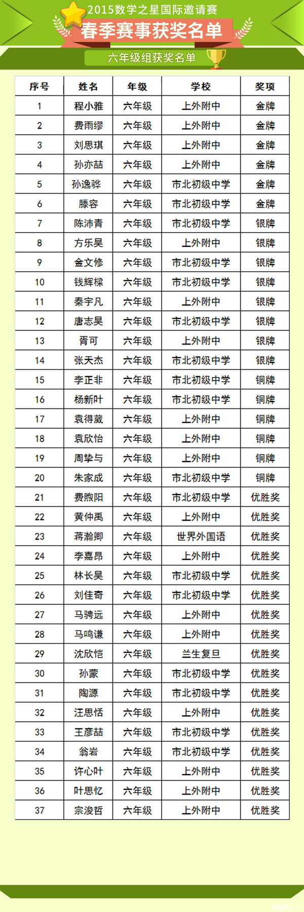“数学无国界”国际竞标赛2015数学之星获奖名单(2)