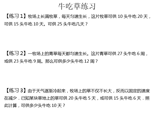 首先,热烈欢迎各位同学进入四年级的学习当中,这学习和上海小升初升学的压力就进一步来临了,尤其是目标为杯赛和四校的牛娃们,一定会早做准备吧,即使是普娃,笨鸟先飞也是必要的,因此在四年级一定要打好基础,为杯赛和上海小升初蓄力以待!下面就开始10天暑假专题集训——第一天牛吃草练习题和答案。