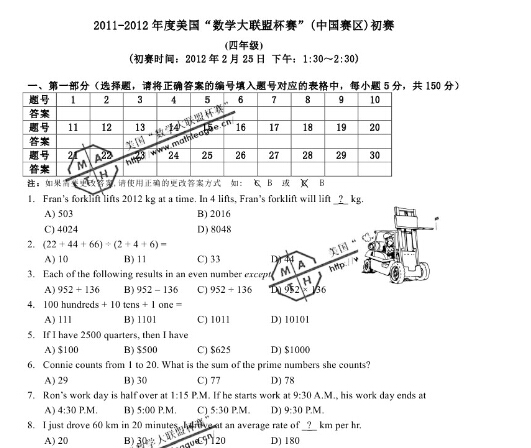 2015-2016年度美国“数学大联盟杯赛”初赛(上海地区)赞定在11月14日开考。为了帮助上海考生更好的了解数学大联盟的题型,下面分享一下2011-2012年上海四年级数学大联盟竞赛真题,供参考。