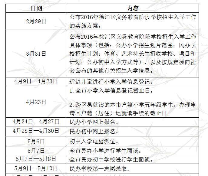 附:2016年徐汇区义务教育阶段学校招生入学工作日程安排