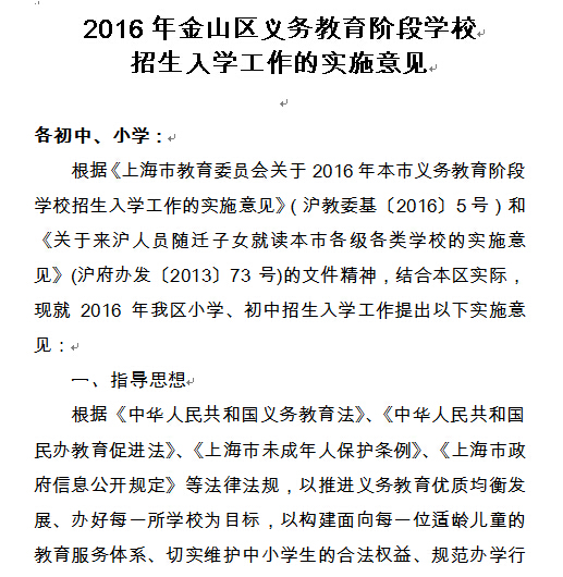 2016年上海金山区小升初招生工作实施意见(招生政策公布),详情如下。