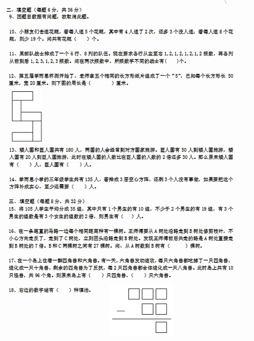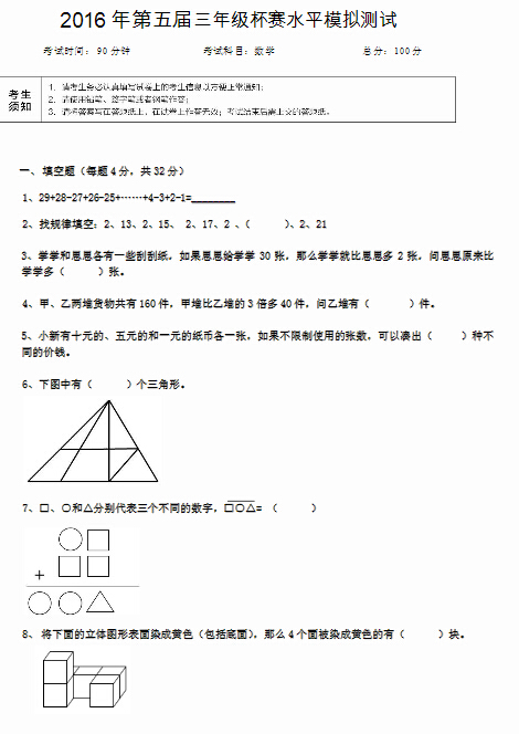 三年级杯赛水平模拟测试数学试题及解析