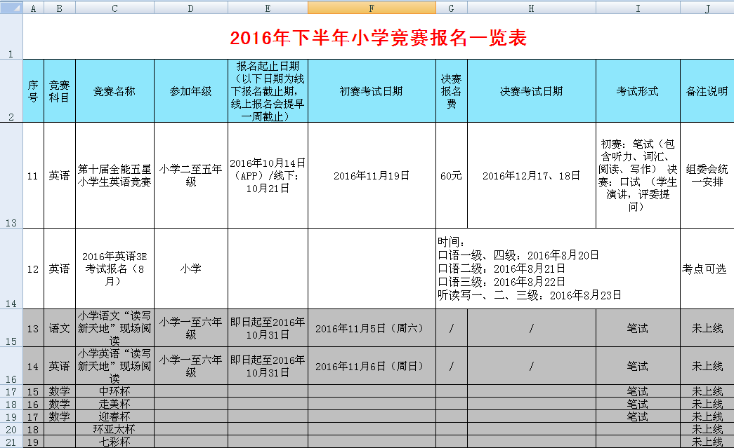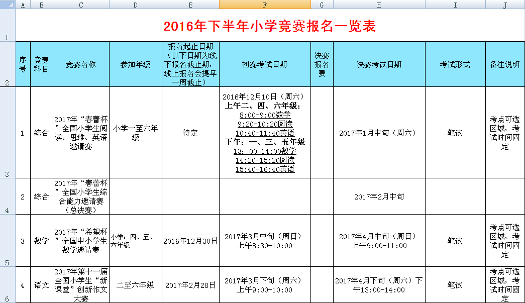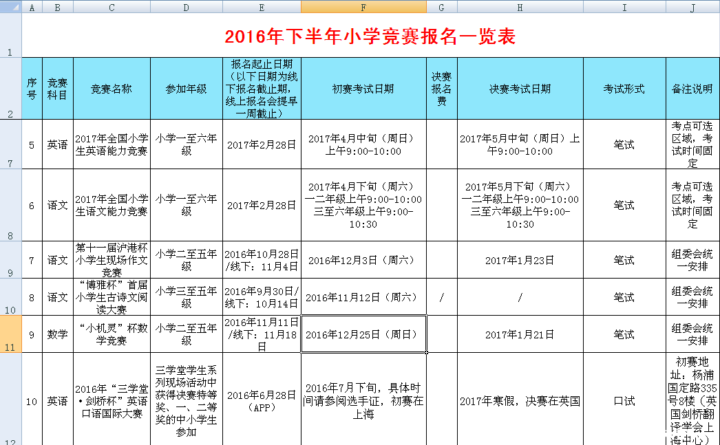 现在是上海各大杯赛集中报名季,为了方便上海关注杯赛的考生及时了解上海各大杯赛的报名动态,下文梳理了2016年下半年上海小学竞赛报名一览表表,供参考。