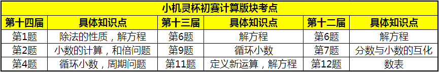 从图中内容来看,计算在一次考试中基本占到2-3题左右,分数大约占到10%左右且计算题基本处于一张试卷的开头(第十二、十三届小机灵杯的前5题为智力冲浪题,数学题从第6题开始)并且我们不难发现,无论是哪一个杯赛解方程这个内容都是重中之重,基本上可以说是每年必考的内容,更何况方程本来就是我们解决难题的利器,必须熟练掌握。